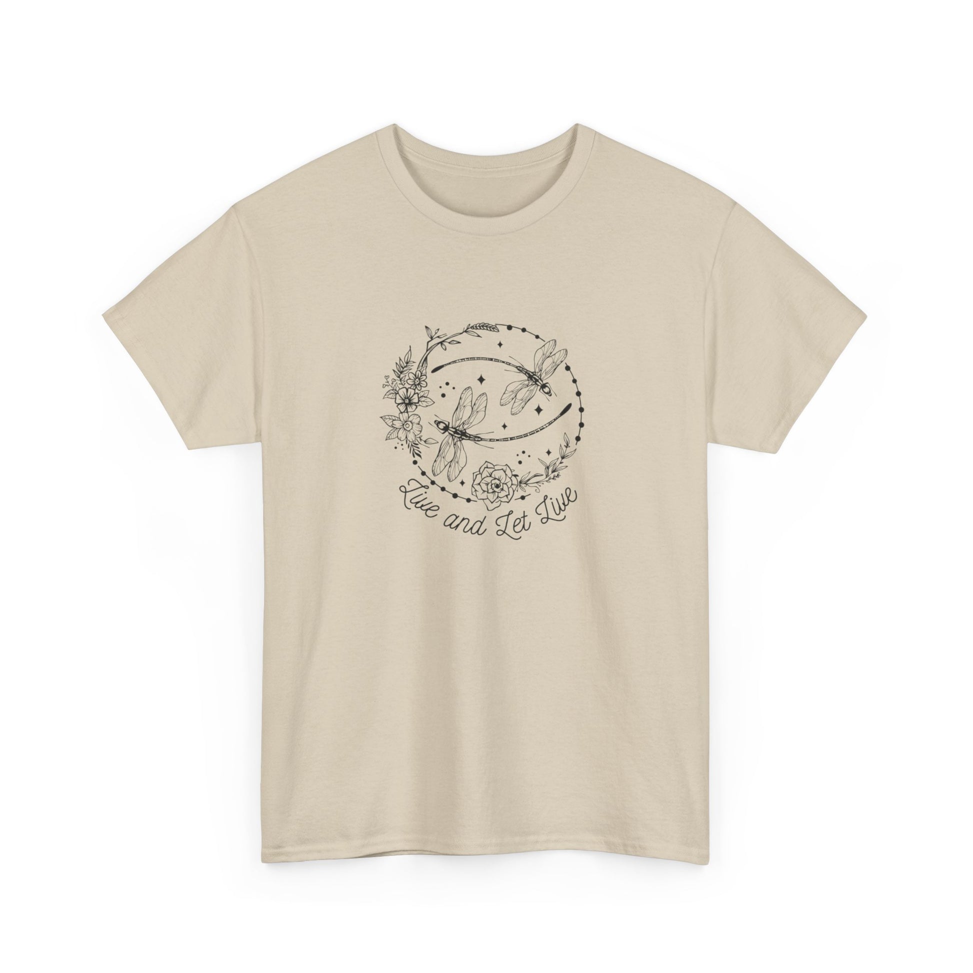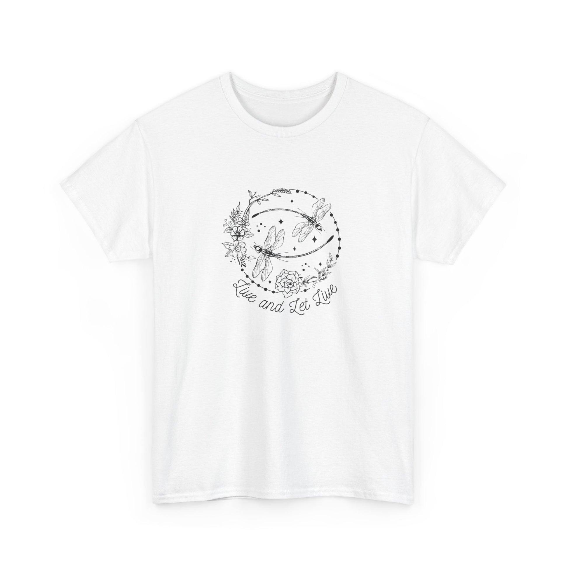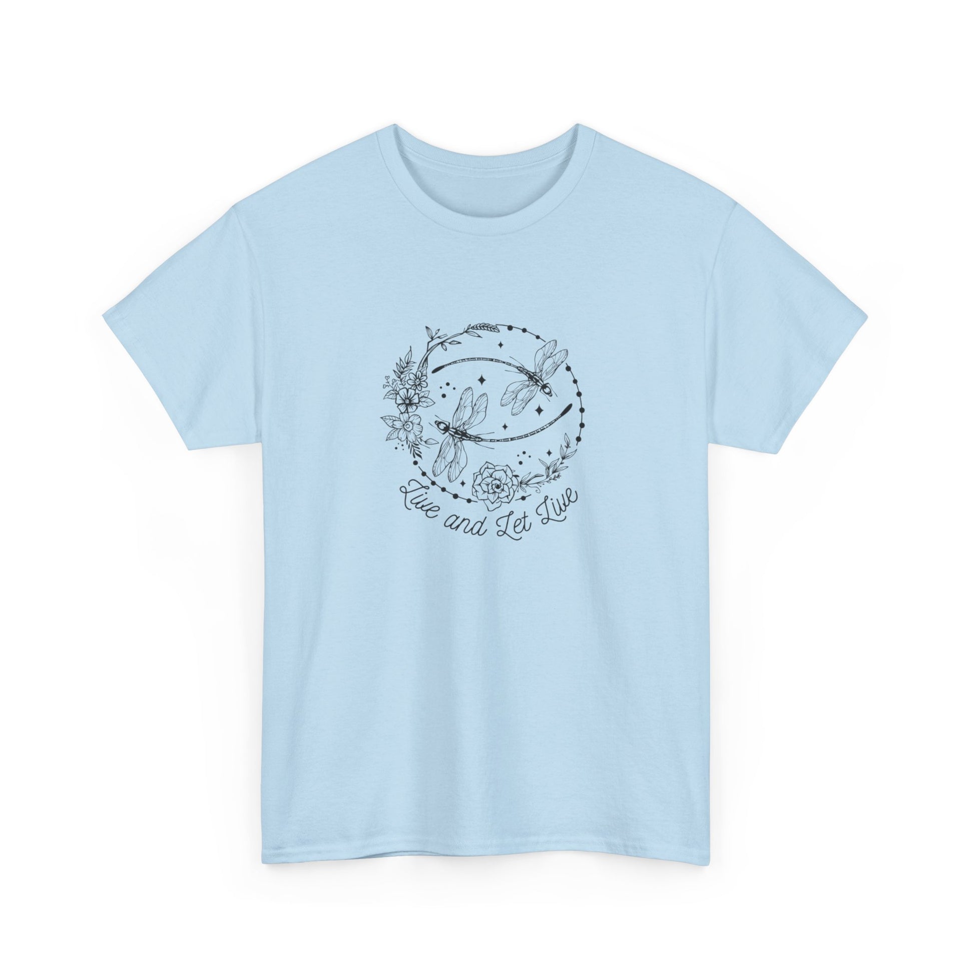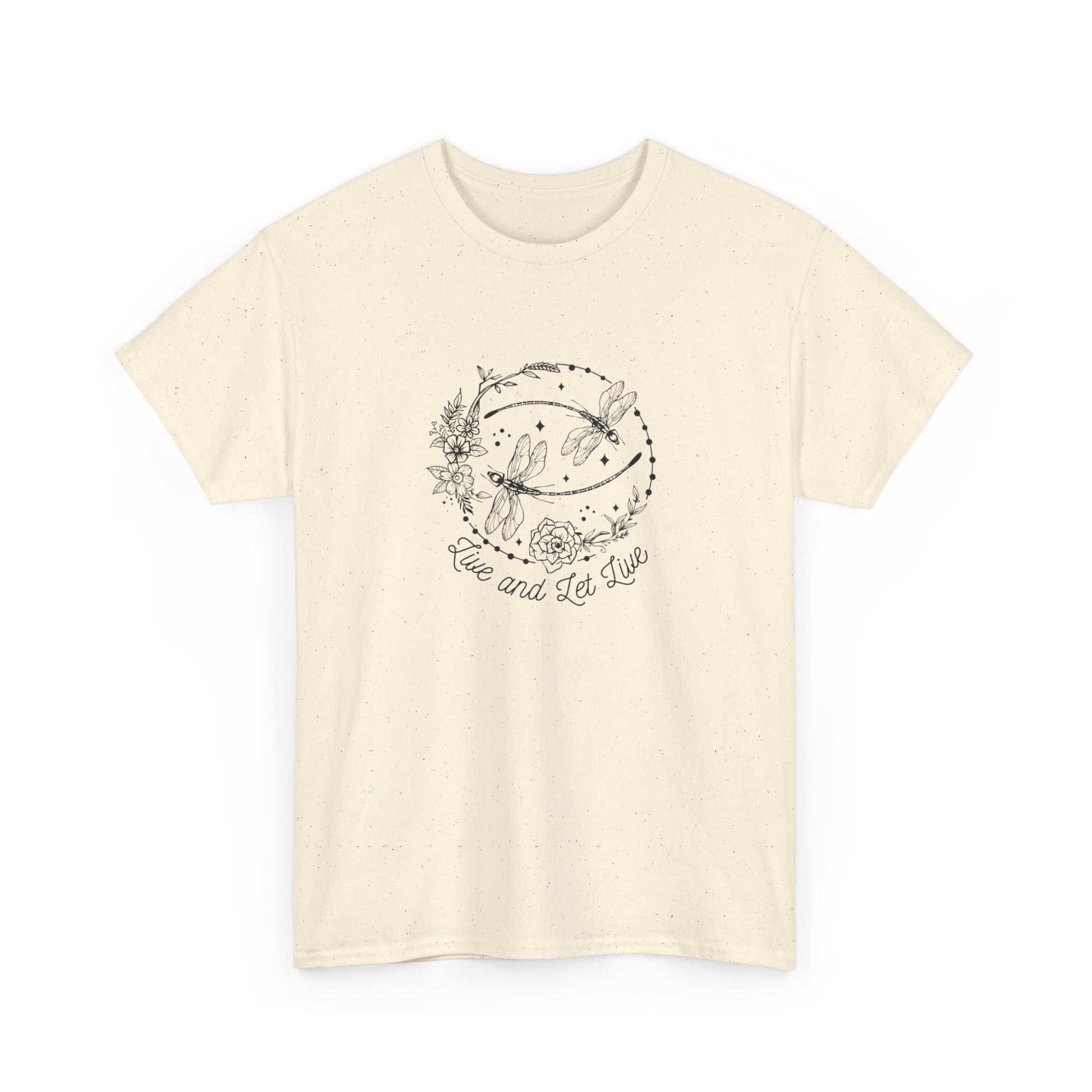 Embrace your free-spirited style with this beautifully designed tee featuring an enchanting hand-drawn illustration. The front showcases delicate dragonflies dancing around blooming flowers within an elegant circular border, all anchored by the inspiring "Live and Let Live" script below.