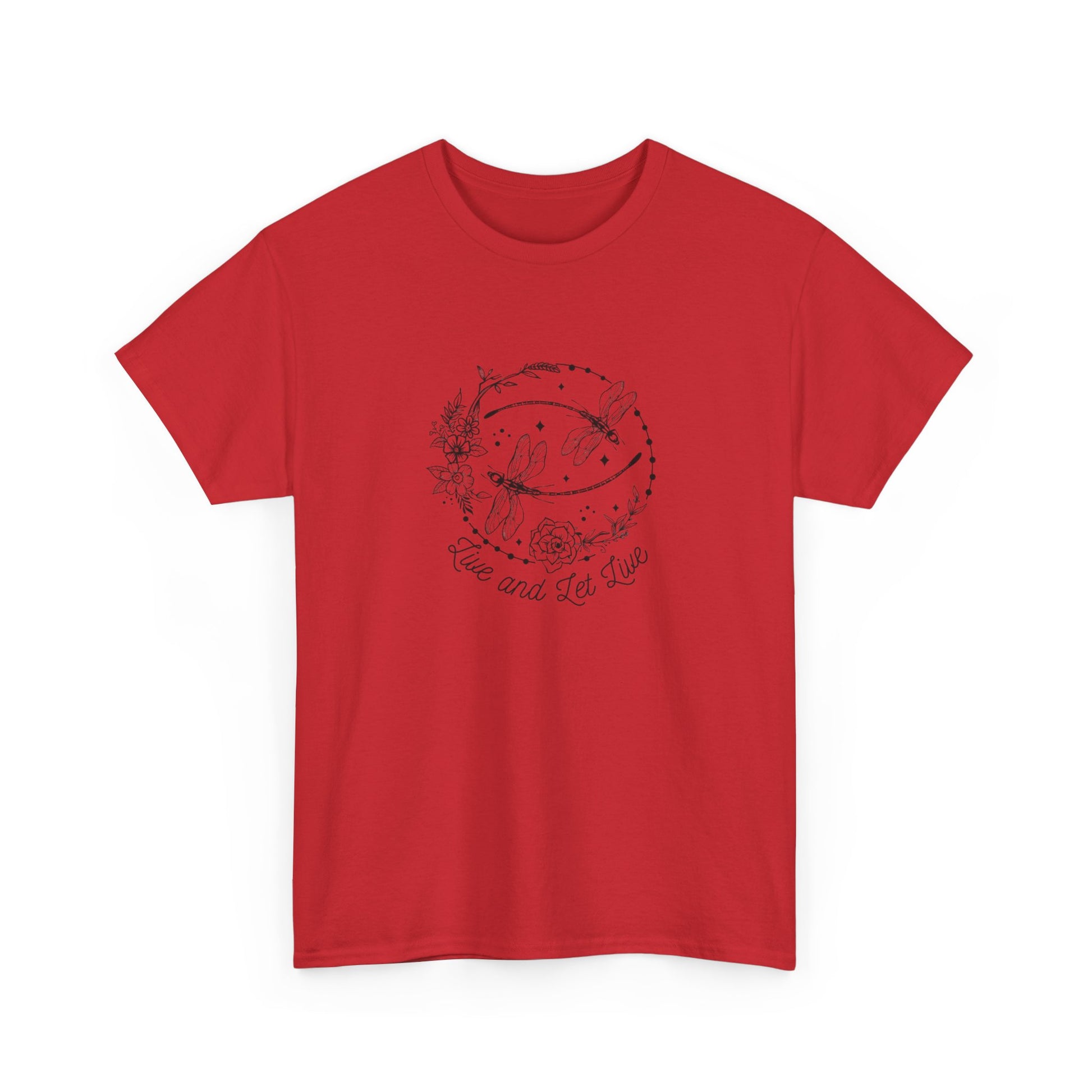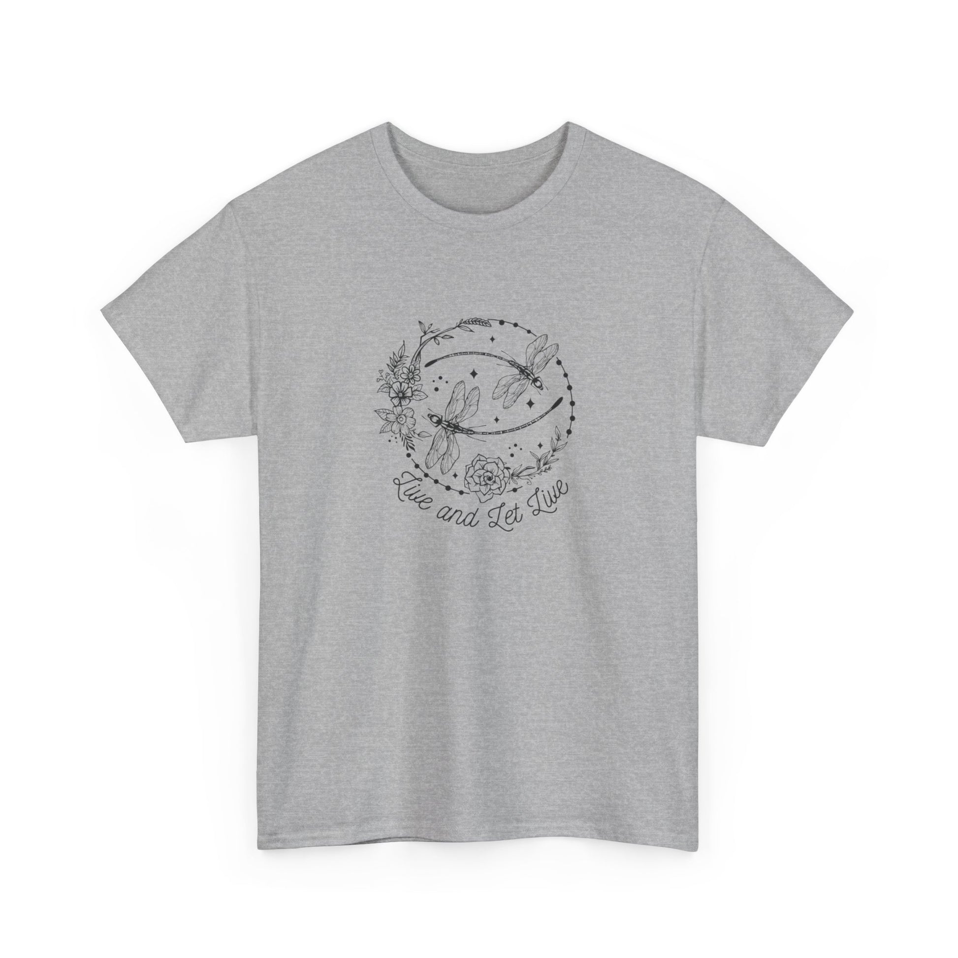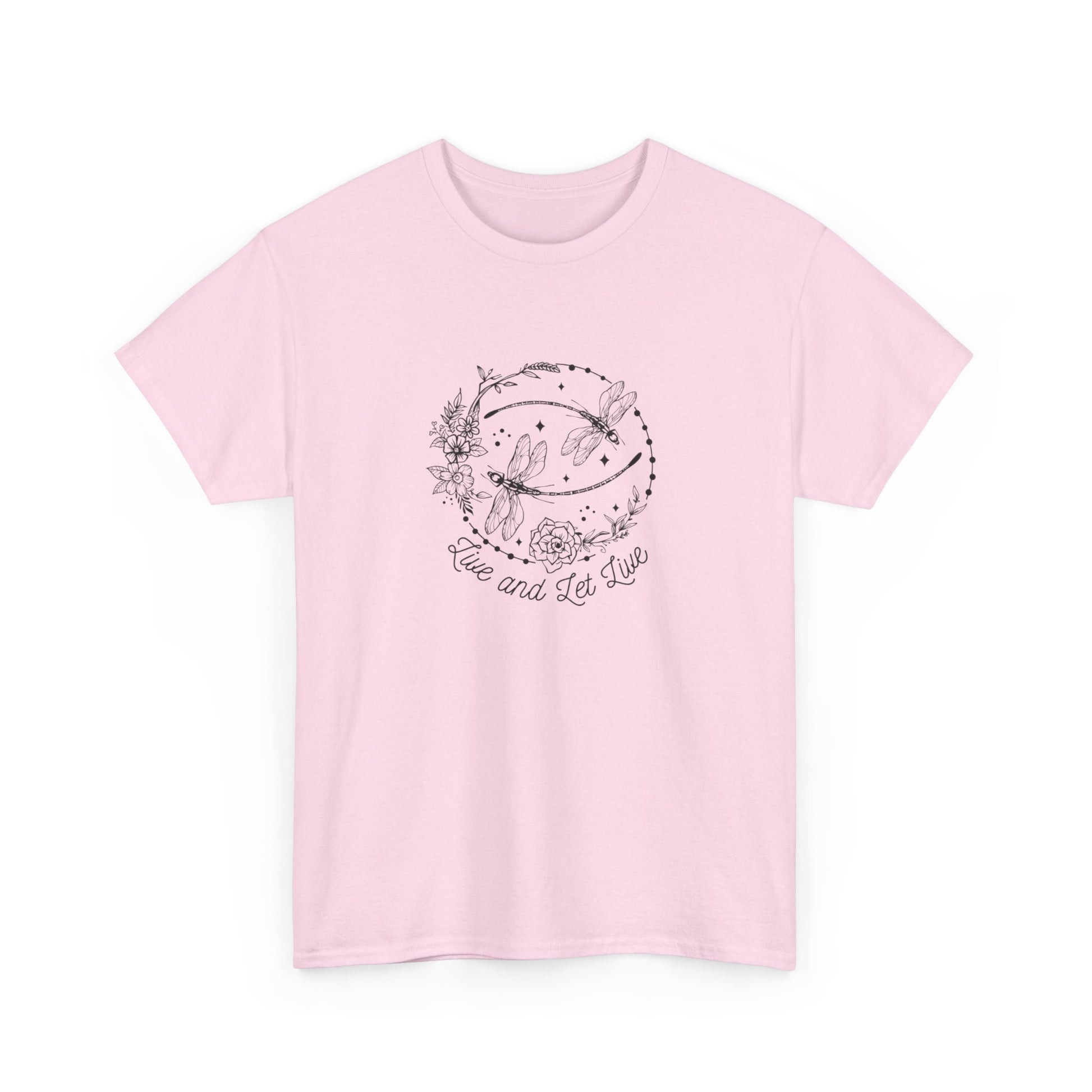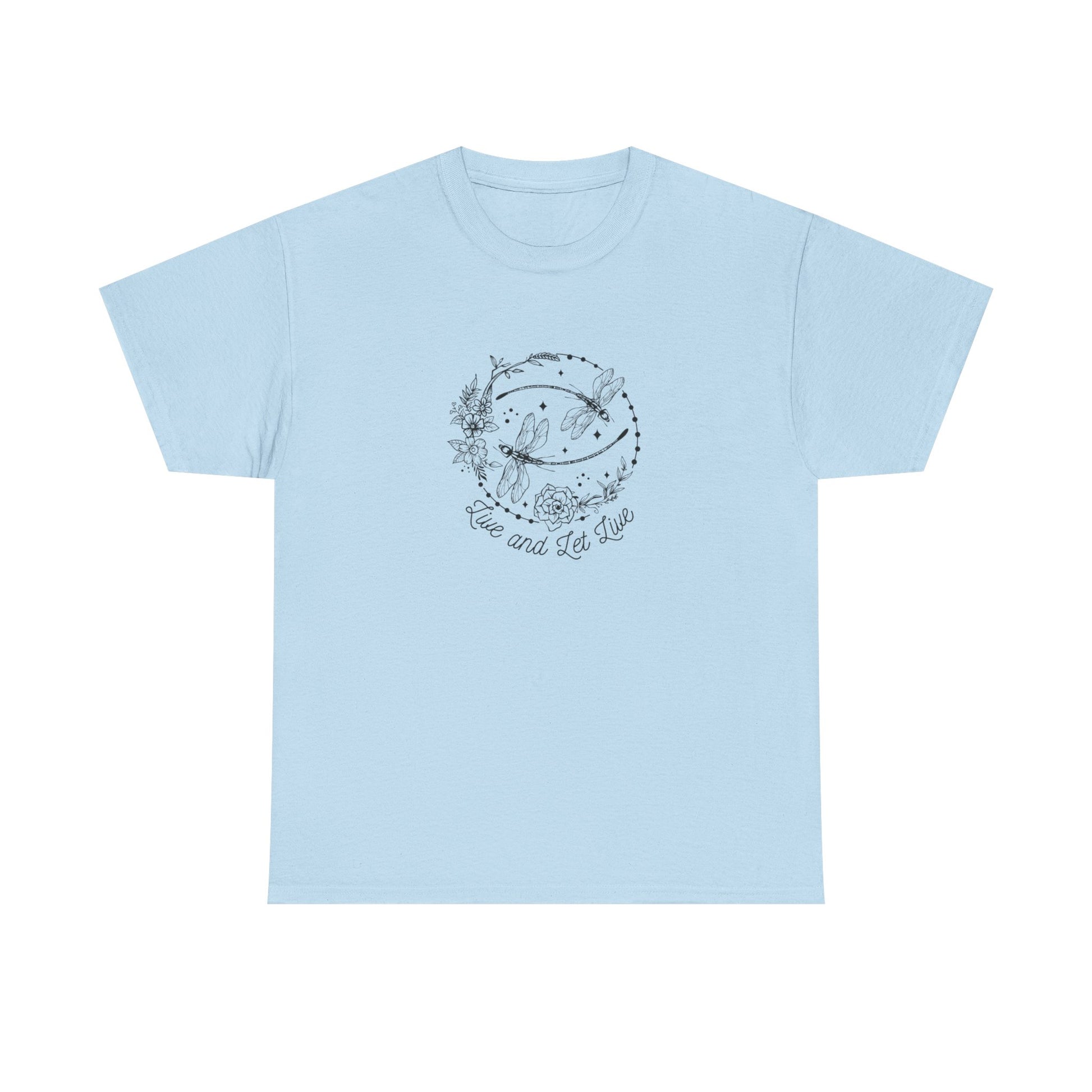 Embrace your free-spirited style with this beautifully designed tee featuring an enchanting hand-drawn illustration. The front showcases delicate dragonflies dancing around blooming flowers within an elegant circular border, all anchored by the inspiring "Live and Let Live" script below.